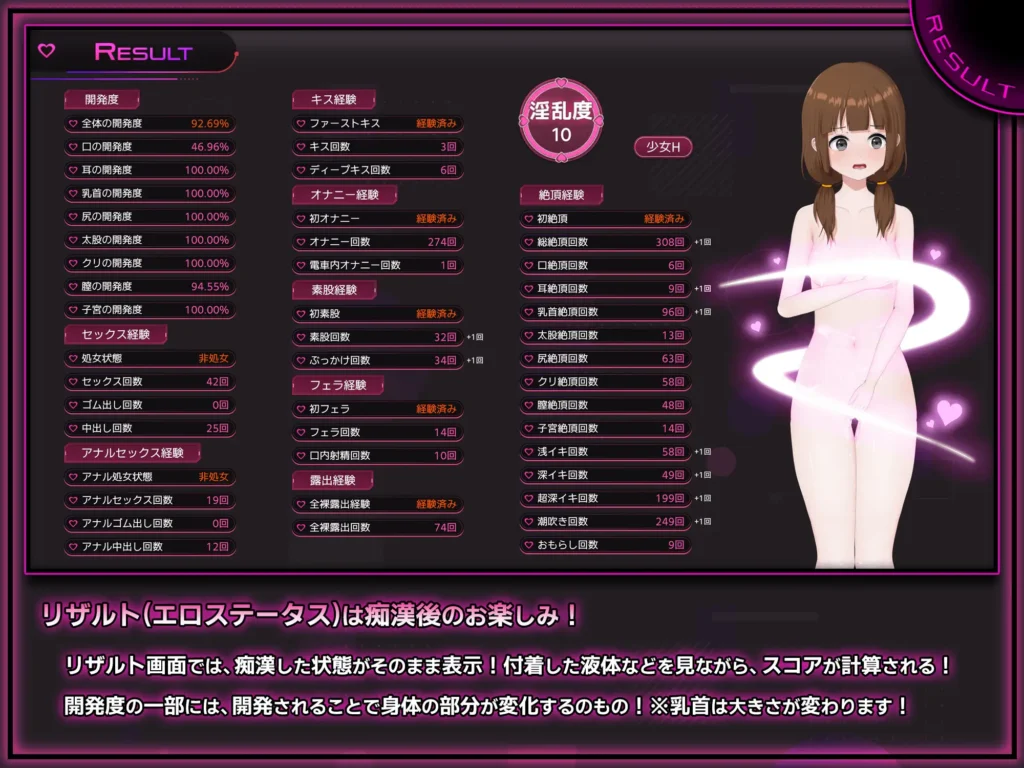 プレイのマンネリを防げる - リザルトでエロステを確認でき、よりエロスを追求できる。